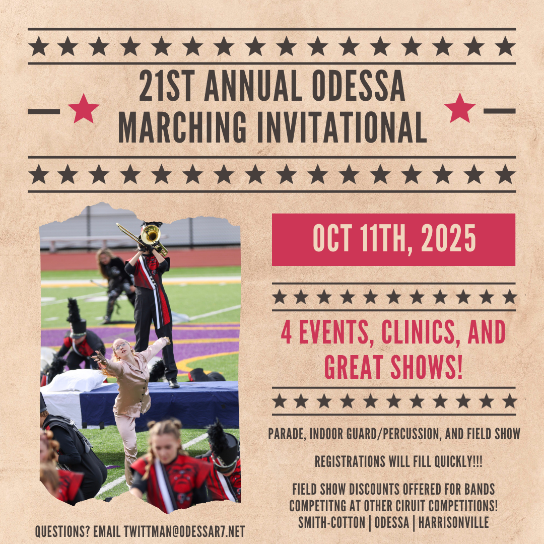 The 21st Annual Odessa Marching Invitational will feature a separate parade competition, field competition, indoor guard, and indoor percussion competitions. The field competition will be judged by a mixture of strong regional and national adjudicators. Classification is determined by school size and will be dependent on the number of entries received. Registration discounts will be offered to bands participating in other circuit festivals! Our circuit includes the Odessa Marching Invitational, Smith-Cotton Invitational (10/04), and the Royal Regiment Invitational (10/18). An overall Grand Champion will be named based on TOTAL scores across all four categories of competition. Each band will receive a clinic immediately following their Field Show Performance! We will have 2 separate award ceremonies, one for White and Red Class and another for Black and Gray Class. These ceremonies will take place immediately after those classes have concluded. Grand Champion and overall captions will be awarded at the final award ceremony of the night! ***REGISTRATION IS NOW CLOSED***